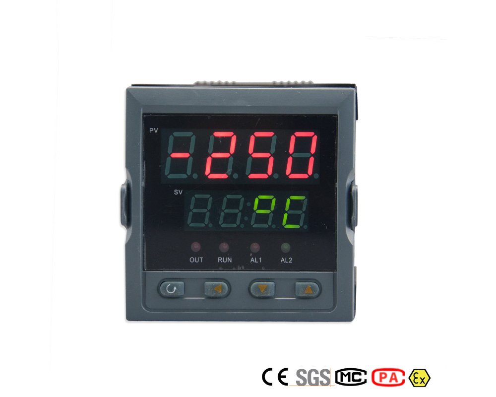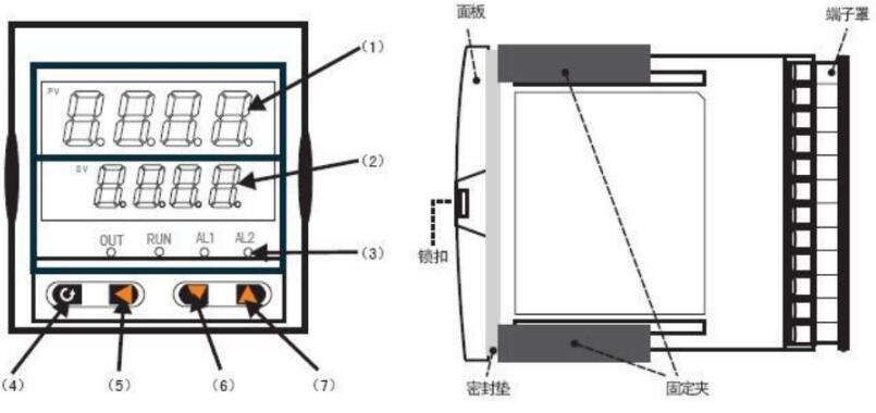 简易型单回路数字显示控制仪,操作简单,0.3级测量精度,7款外型尺寸,双四位LED显示,可支持热电偶、热电阻、电压(可开方运算)、电流(可开方运算)及变送器输入,适用温度、压力、流量、液位、湿度等工业过程量的监测。支持2路报警功能,支持1路变送输出或支持采用标准MODBUS协议的RS485通讯接口,1路DC24V馈电输出,输入端、输出端、电源端光电隔离,100-240V AC/DC或12-36V DC开关电源供电,标准卡入式安装,工作环境温度在0-50℃,且相对湿度5-85%RH无凝结。 显示面板外观结构图: