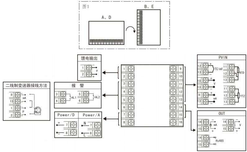注:横竖式仪表后盖接线端子方向不一样,见示意图: