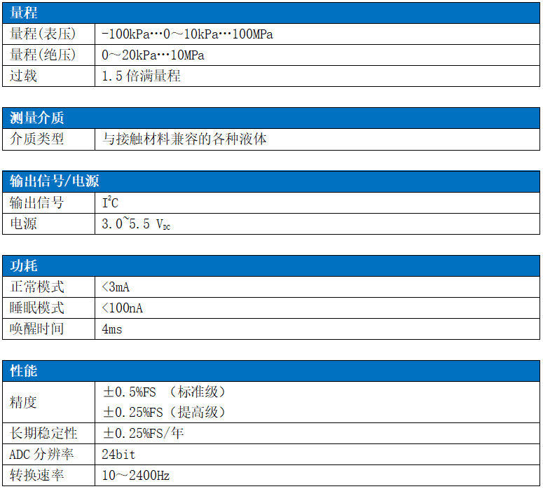 HP10LC数字压力传感器是一种采用316不锈钢波纹膜片隔离的充油式OEM 压力芯体。敏感元件选用国际先进的高稳定、高精度硅压力芯片,应用最新的生产工艺和高精度的生产检验设备,使产品具备了极好的稳定性,通过专用集成线路进行-10~70℃宽温区温度补偿和非线性修正,直接输出标准I2C数字信号。 产品经过长期老化及稳定性筛选,性能可靠稳定,功耗很低,可以方便对接各种设备或无线模块,组装简便,应用性强,可广泛应用于各种流体压力的检测,也广泛应用于物联网行业的各类压力检测。