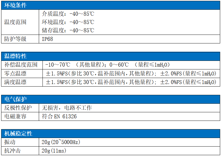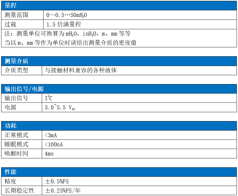 HPM410LC型低功耗液位传感器采用了高品质和高稳定性的压力芯体作为感测元件,把与液位深度成正比的液体静压力准确测量出来,并经过信号调理电路转换成标准的I2C信号输出,实现对液体深度的测量。该产品能外接锂电池供电,功耗极低,使用寿命长。另外该产品能连接无线模块实现无线传输。 产品经过长期老化及稳定性筛选,性能可靠稳定,功耗很低,可以方便对接各种设备或无线模块,组装简便,应用性强,在地下水、江河湖海、地面水箱和库存水箱等场合有广泛的应用,也大量应用于物联网行业的各类液位检测。