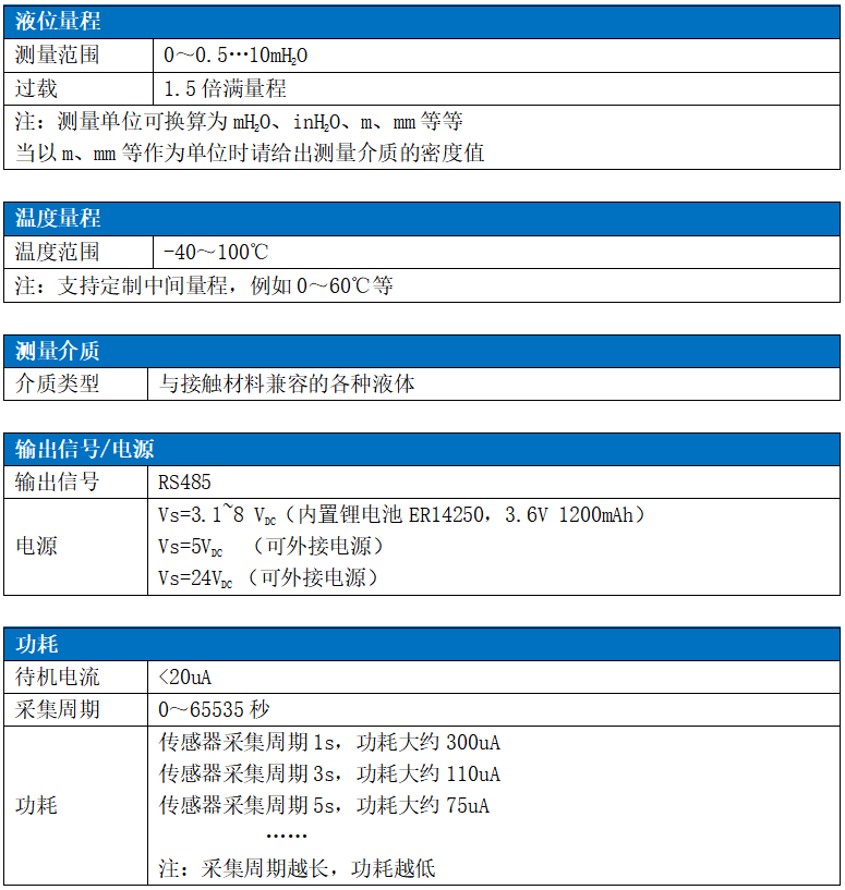 ◆ 液位和温度同时测量 ◆ 内置锂电池供电 ◆ 低功耗 ◆ 现场显示,交替显示液位和温度 ◆ 带485通讯,可适配无线模组