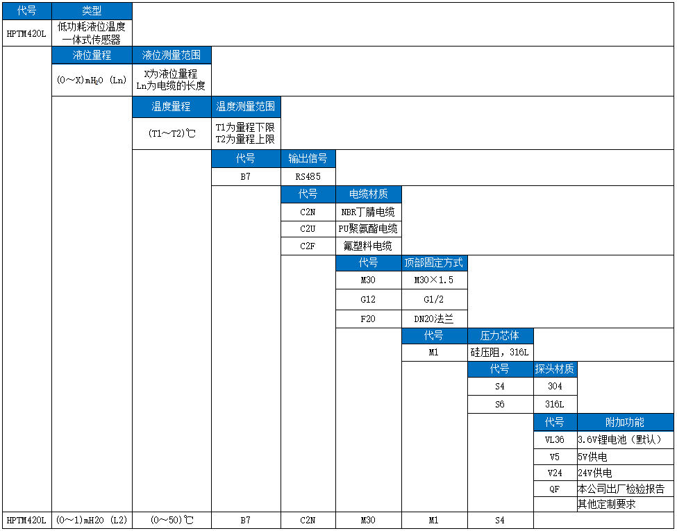 HPTM420L型低功耗液位温度一体式传感器采用了高品质和高稳定性的压力芯体作为感测元件,把与液位深度成正比的液体静压力准确测量出来,并经过信号调理电路转换成标准的RS485信号输出,实现对液体深度的测量。产品的探头部分内置高精度的感温元件,能同时测量出液体的温度。该产品内置锂电池供电,功耗极低,使用寿命长。另外该产品带现场显示,可交替显示液位和温度值,也可以通过RS485实现组网或者连接无线模块实现无线传输。 产品经过长期老化及稳定性筛选,性能可靠稳定,能够适用于环境比较恶劣的露天场所,在地下水、江河湖海、地面水箱和库存水箱等场合有广泛的应用。