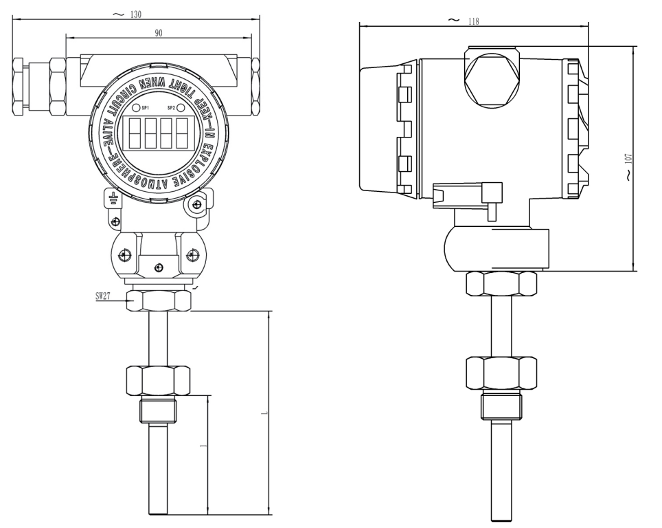 HTM208防爆型温度开关采用PT100等作为信号测量元件,放大电路位于防爆壳体内,由高精度的A/D转换,经微处理器运算处理,现场显示,并输出一路模拟量和两路开关量。该产品集温度测量,显示,输出、控制于一体,广泛应用于工业过程控制、石油、化工、冶金、矿用等行业。本产品符合GB3836.1-2010 《爆炸性环境 第1部分:设备 通用要求》、GB3836.2-2010 《爆炸性环境 第2部分:由隔爆外壳"d"保护的设备》的规定。防爆标志ExdⅡCT6 ,在下列海拔和环境空气温度以及环境相对湿度条件下,隔爆型压力传感器可以正常运行:海拔不超过2000m;环境空气温度-10℃~+60℃;环境相对湿度为90%(+25℃)。